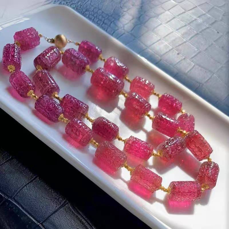 天然卢比来宝石红碧玺回纹珠项链18k金设计可做锁骨链毛衣链女款